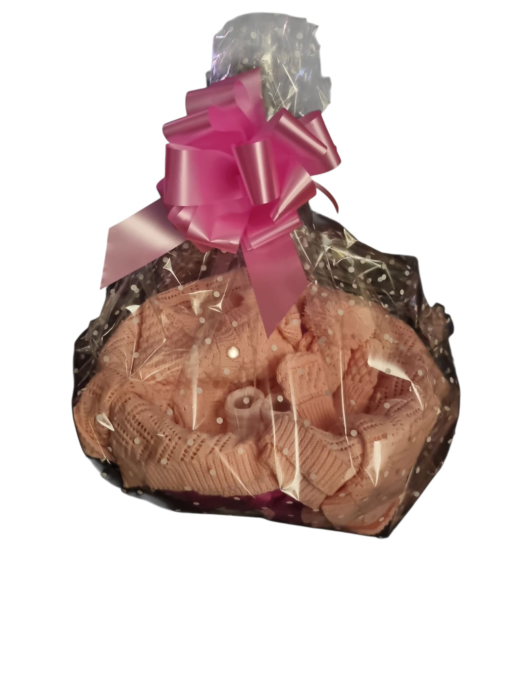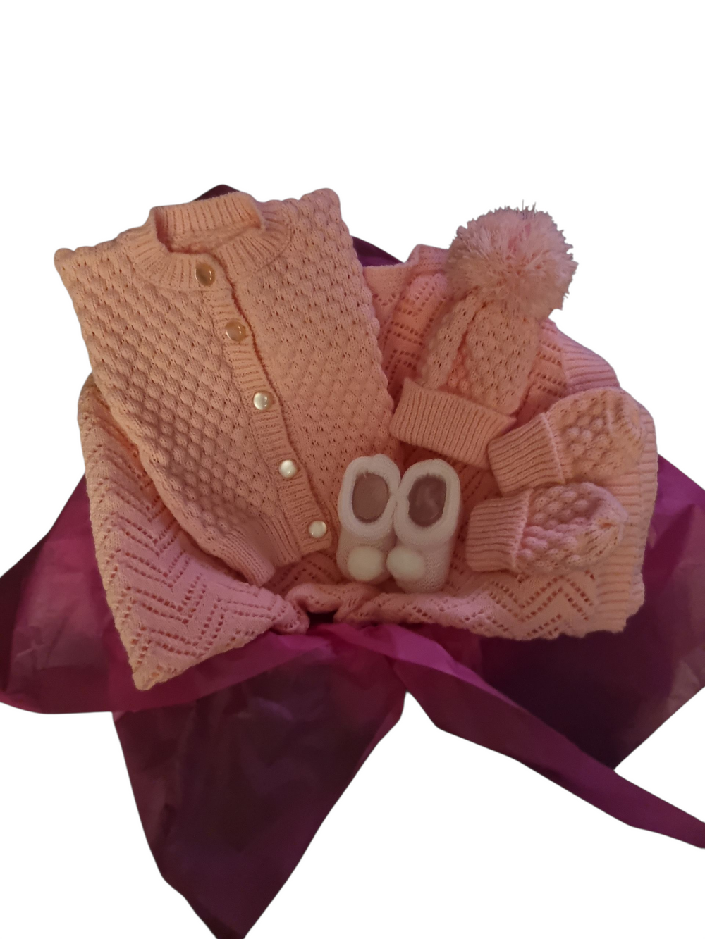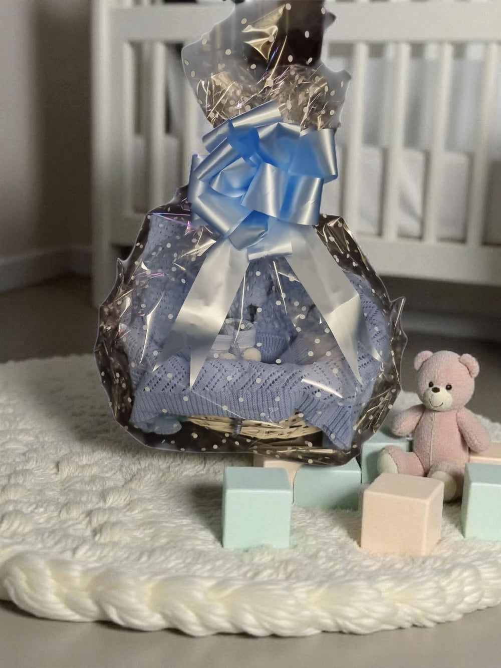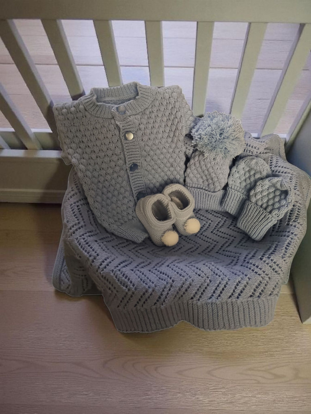 This luxury knitted gift basket is a perfect present for a baby shower or maternity gift. Handmade in the Scotland, , it is suitable for both boys and girls. The basket includes a collection of high-quality knitted items such as fine knitted lace blanket, and accessories baby cardigan, matching pom pom hat mitts and baby shoes, making it a thoughtful and unique gift for new parents. Although the items are not personalised, the attention to detail and craftsmanship of the handmade items make this gift basket a special and luxurious choice for any baby occasion.