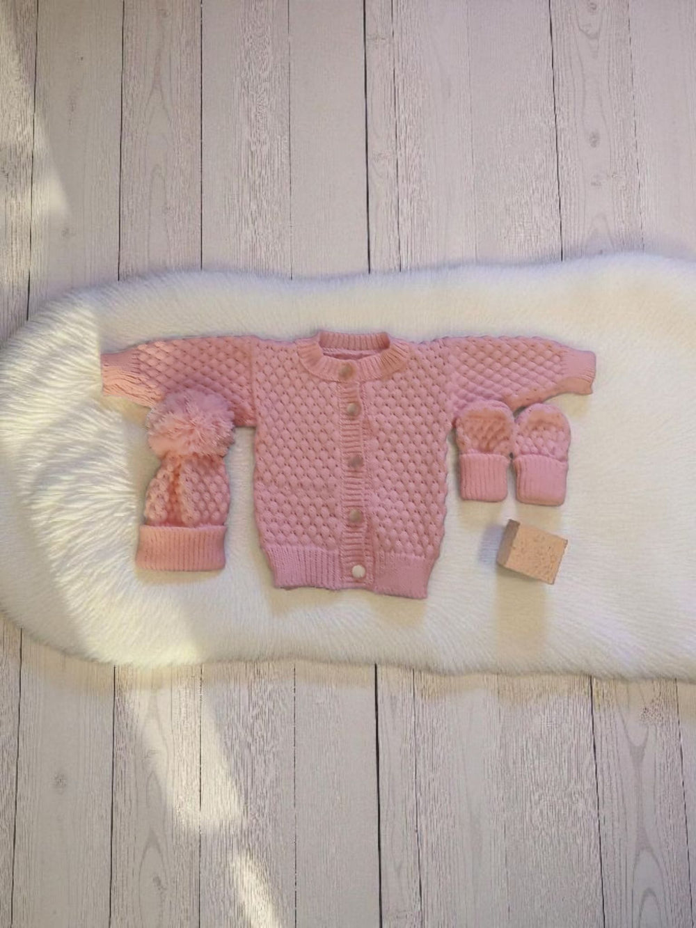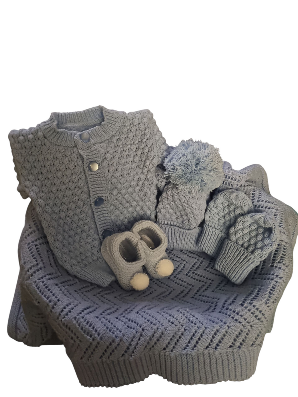 Baby fine knit lace blanket, matching cardigan pom pom hat & mitts set.