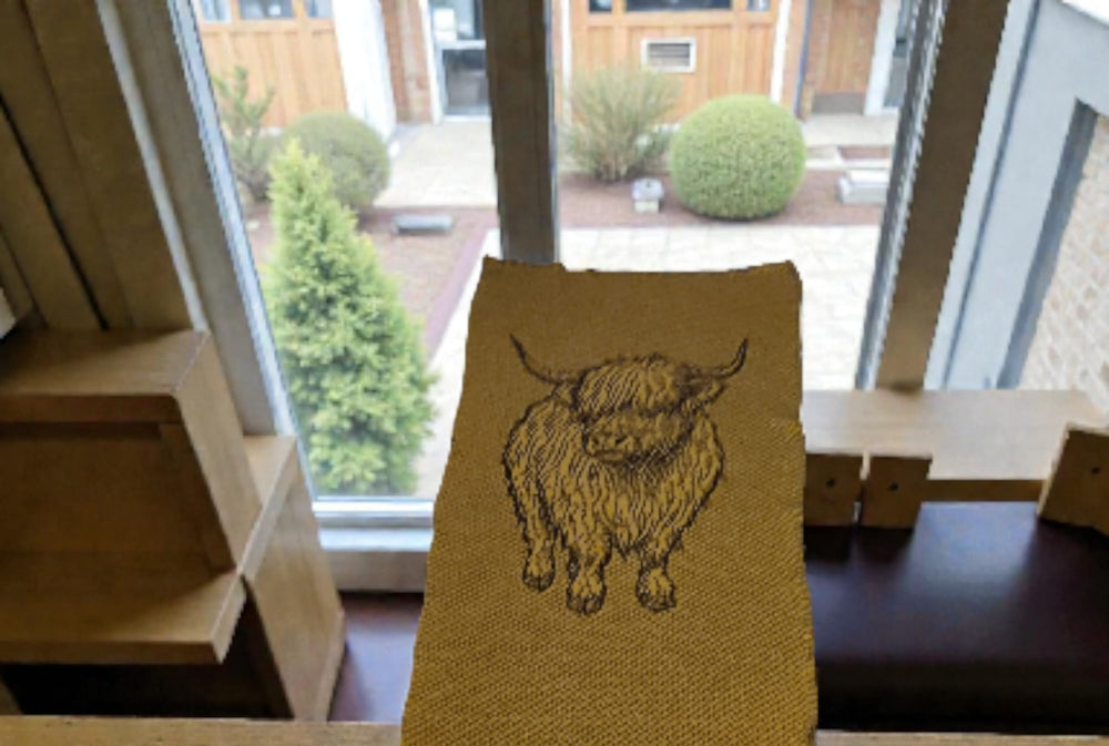 Detailed Highland cow design on soft, textured fabric